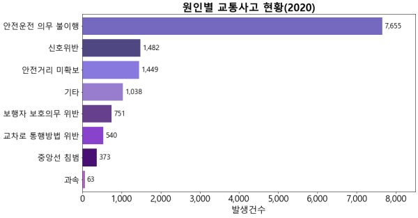 2020년의 교통사고 주요 원인으로는 안전의무 불이행이 7,655건으로 가장 많았다. 신호위반이 1,482건, 안전거리 미확보가 1,449건으로 다음 순을 기록했다.